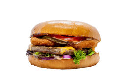 Dubbele beefburger met cheddar cheese, bacon, burger inn saus, sla, tomaat, ui, augurk en double cut bunn