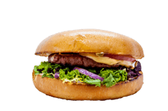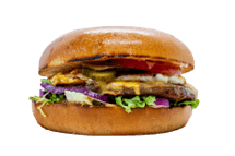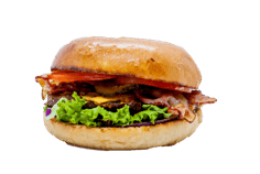 Beefburger met bacon, cheddar cheese, sla, tomaat, ui, augurk, tasty saus en golden brioche bun.