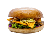 Beefburger met cheddar cheese, guacamole, burger inn saus, tortilla chips, sla, tomaat, ui, augurk en golden brioche bunn