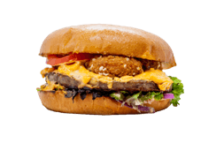 Beefburger met cheddar cheese, fried onion rings,bacon, sla, tomaat, ui, augurk en golden brioche bunn